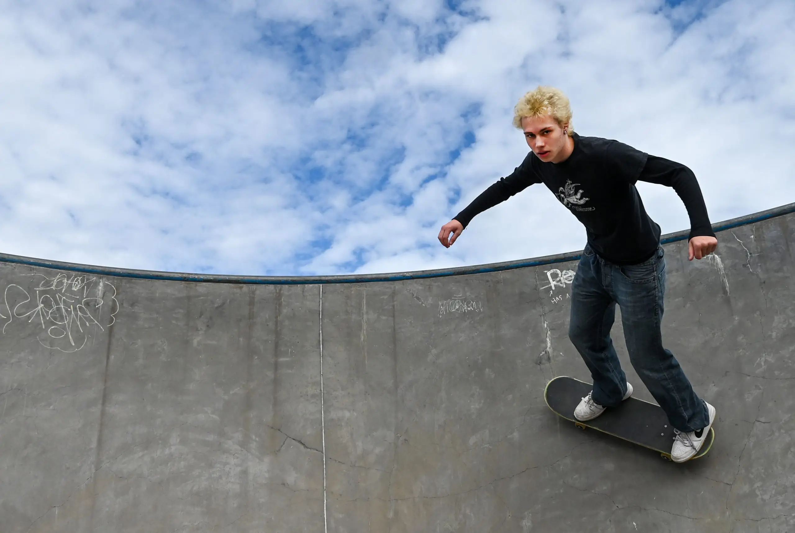 In cross country coverage, natural leading lines guide the reader’s eye toward the copy. In skate and football photos, worm’s-eye views add intensity. Each image feels purposeful, not accidental.